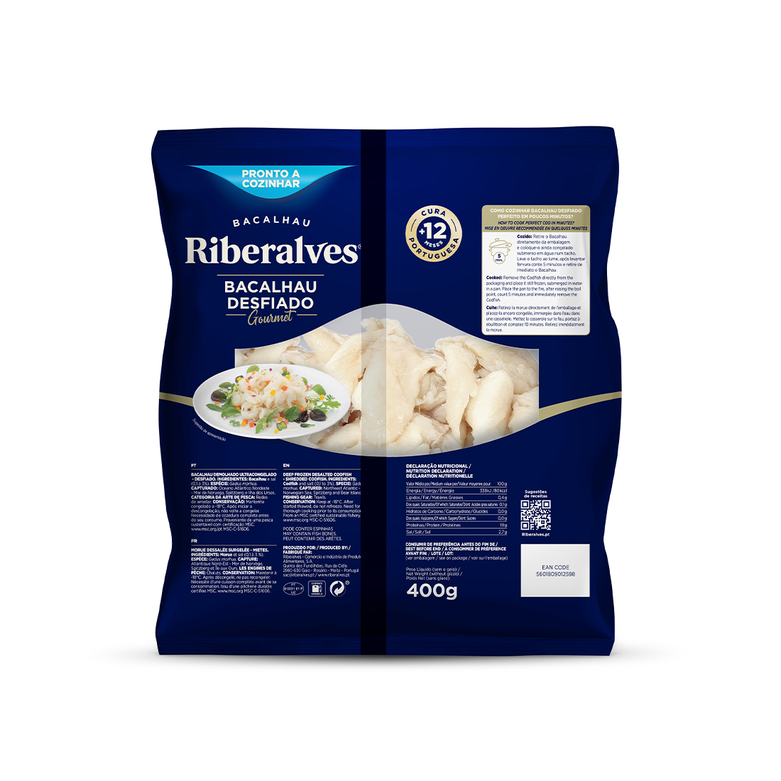 Desfiado Bacalhau +12Meses iva incluído 6,29 €Desfiado Bacalhau +9Meses Desfiado Bacalhau +12Meses iva incluído AdicionarBacalhau do Atlântico (Gadus Morhua) Desfiado, demolhado e ultracongelado Tempo de Cura: 12Meses Apresentação: Embaladas em saco de plástico de 400gr Produtos Relacionados Lombos Gourmet +12Meses iva incluído 40,99 € Quantidade de Lombos Gourmet +12Meses iva incluído Adicionar Ovas de Bacalhau iva incluído 14,99 € Quantidade de Ovas de Bacalhau iva incluído Adicionar Posta do Lombo +9Meses iva incluído 13,49 € Quantidade de Posta do Lombo +9Meses iva incluído Adicionar Línguas de Bacalhau +12meses iva incluído 11,49 € Quantidade de Línguas de Bacalhau +12meses iva incluído Adicionar
